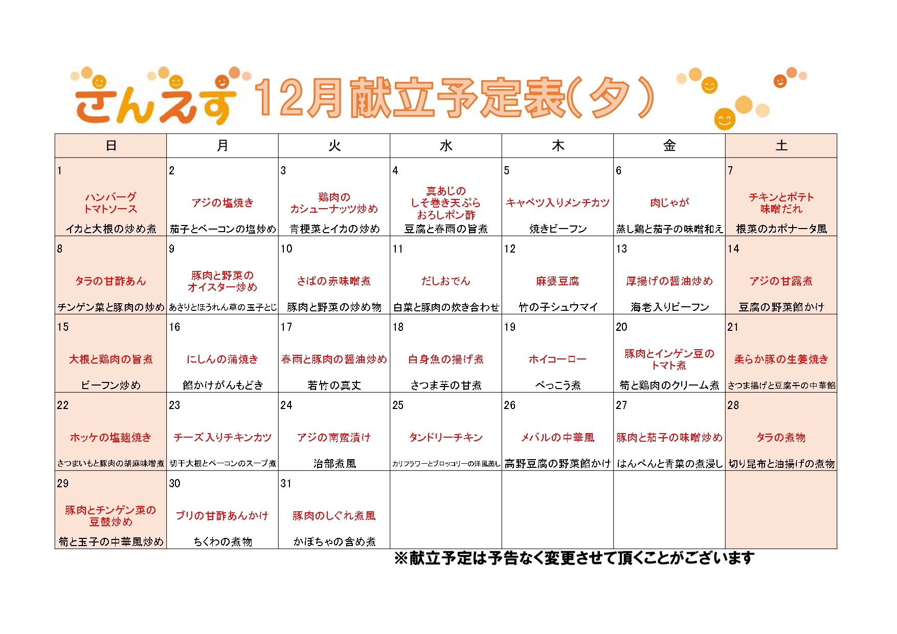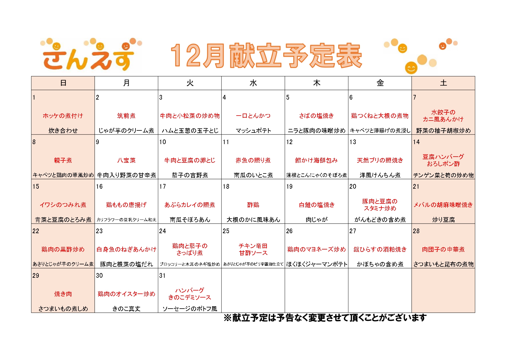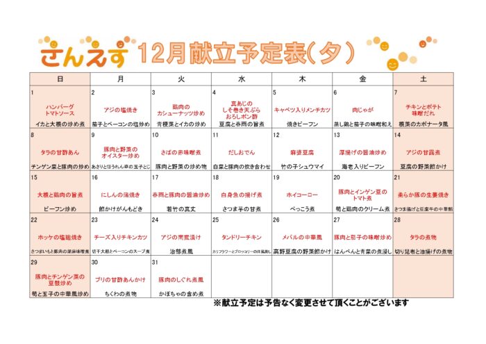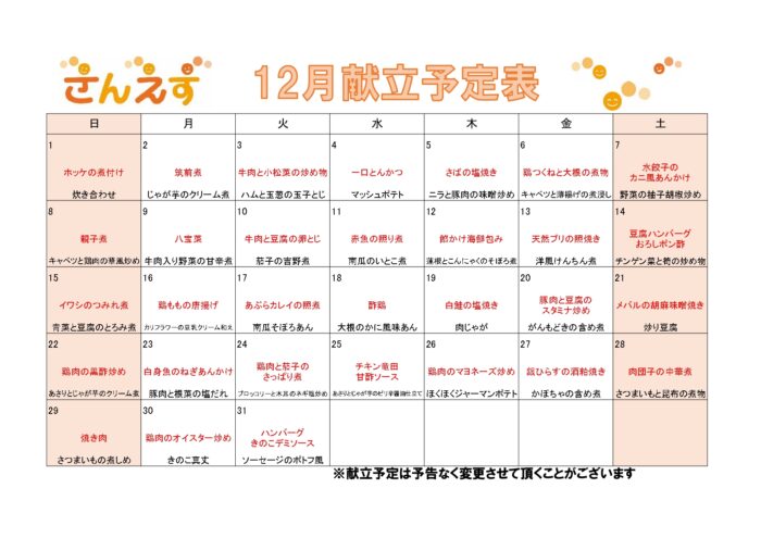 令和6年12月の献立予定表